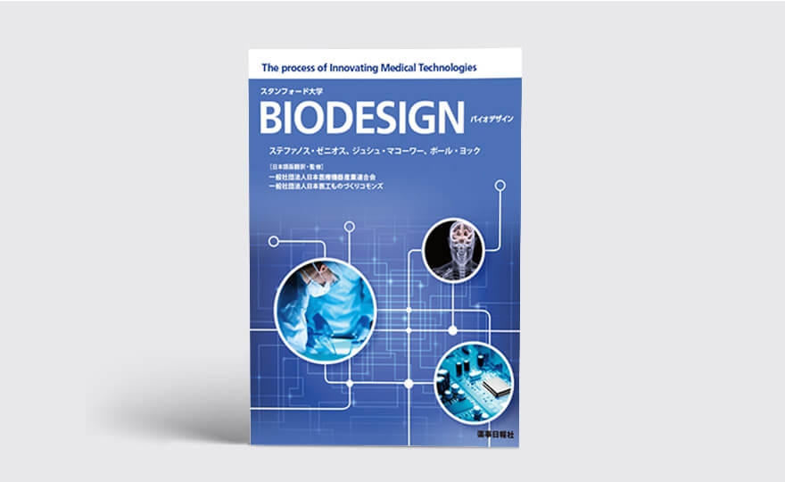 東京大学医学部附属病院 国立大学病院データベースセンター様 年次報告書 制作実績ページへバイオデザインプログラムは米国でバイオデザイン教育プログラムのテキストとして3人の先生により執筆された、医療機器開発のイノベーションを目指すためのテキストです。その出版物の日本語訳版として薬事日報社様より本書籍が出版されました。デザイン制作するにあたり、元の英語版の雰囲気を壊さず、先進的で内容がわかりやすいことを大切に、ブルーを基調にした落ち着いたイメージで表紙を制作しました。