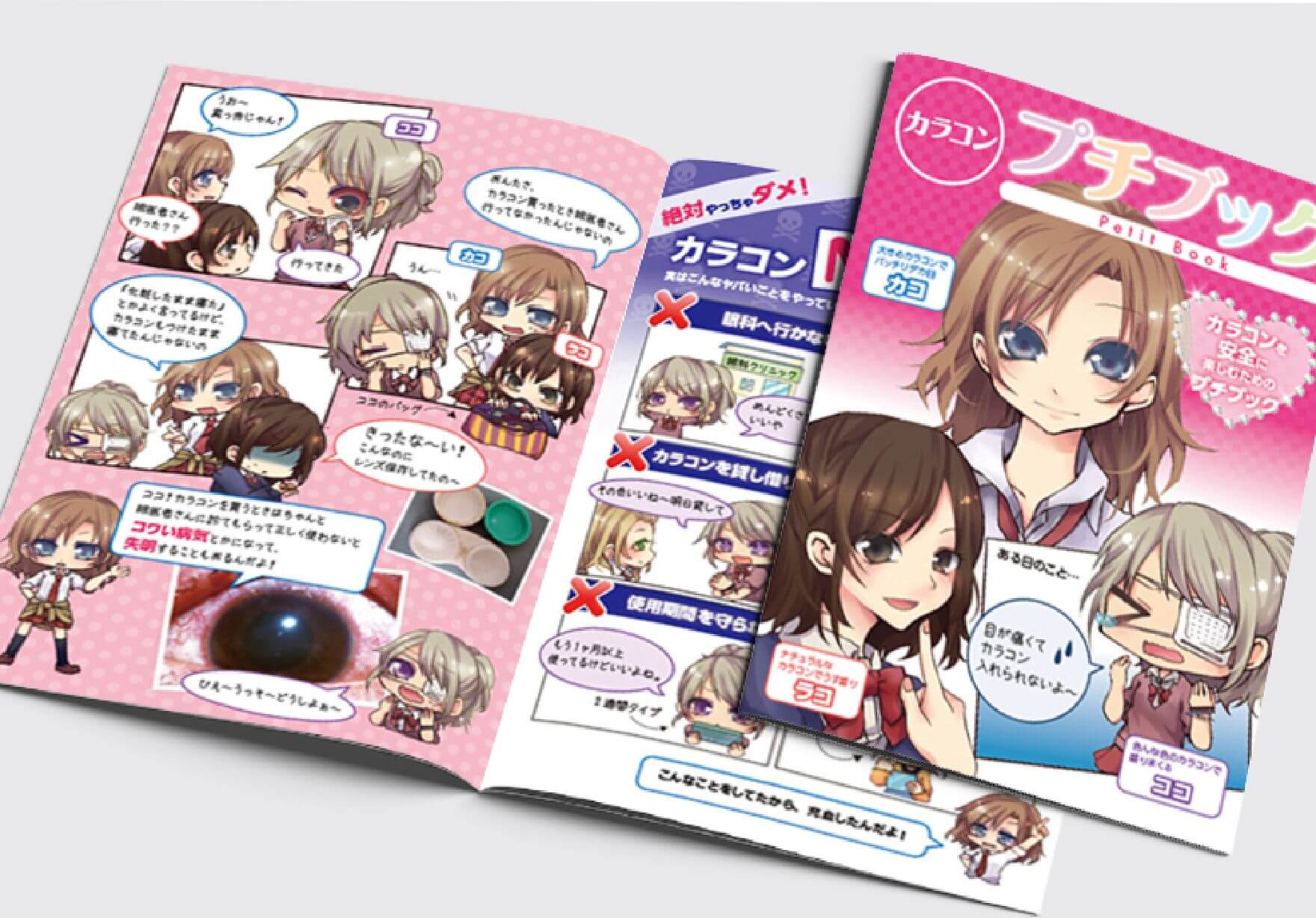 長野県立こども病院様 放射線治療室 イラスト装飾 制作実績ページへ主に中高生を対象に、カラーコンタクトレンズ(カラコン)の不衛生な使い方による眼病発症のリスクと、正しい取り扱い方法を普及させるためのリーフレットです。コンタクトレンズ協会様のサイトでダウンロードできるほか、カラコンが手軽に購入できる量販店でも配布されるため、ターゲット世代が手に取りやすく、共感できそうなテイストのマンガで表現しました。眼病の怖さを知ってもらうだけでなく、マンガを楽しみながら内容の理解が深まるよう、キャラクター設定やセリフなどにも気を配りました。
