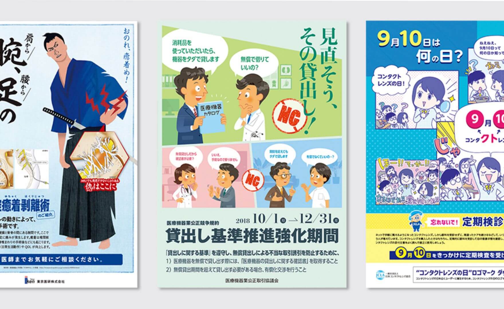 一般社団法人 日本コンタクトレンズ協会様 カラコンを安心に楽しむためのプチブック 制作実績ページへ患者様向けポスター(左)は、痛みのある患者様を侍に見立てたインパクトのあるイラストを採用。医療機器の営業担当者様向けポスター(中)は、「不正な貸し出し」が容易に想起できるよう、3つのNGシーンをコミカルに描いたイラストで表現。「コンタクトレンズの日」を周知させるためのポスター(右)は、人気イラストレーターあらいぴろよさんを起用し、ポップなタッチと色づかいで若年層の目に留まりやすいデザインに。アプリオリでは、ツールの目的やターゲットの属性などに合わせたイラストをご提案します。