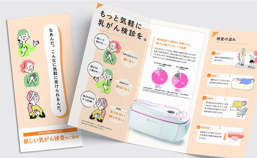 製品カタログは、製品の品種や特徴、スペックなど、細かな情報まで網羅したもので、製品の検討・購入時に不可欠なツールです。アプリオリでは医療系などBtoB製品のカタログを多く手がけています。専門性の高い製品であってもできる限り業界への理解に努め、検索性に優れた使い勝手のよい構成、見やすく美しいデザインをご提案します。パンフレットは、営業、求人、集客など目的はさまざまで、アプリオリの実績でも製品紹介、サービス案内、採用案内、学校案内、病院案内などその種類は多岐にわたります。まずは目的・用途を明確にして情報を整理し、効果的に訴求するための表現、体裁や紙質まで細かくご提案します。
