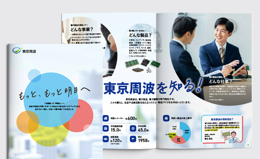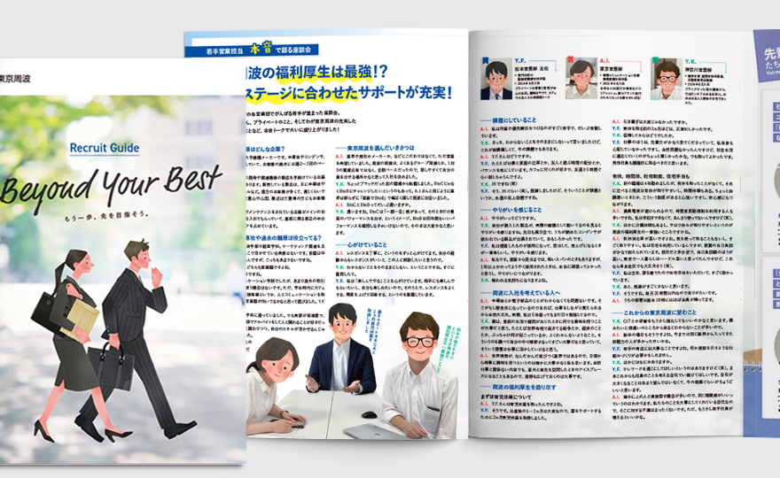 「東京周波を知る!」を軸に展開。商社の仕事を明るいビジュアルで図解した採用冊子