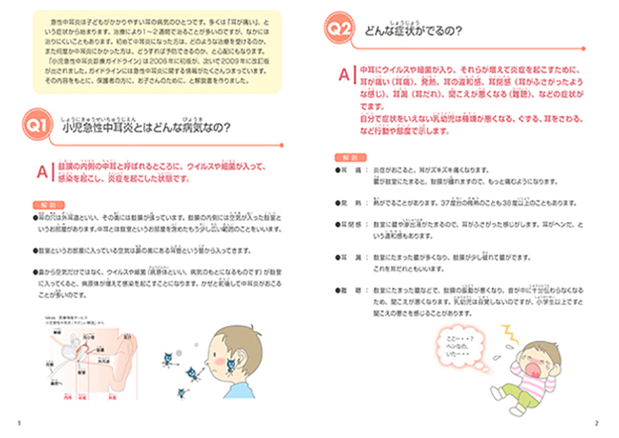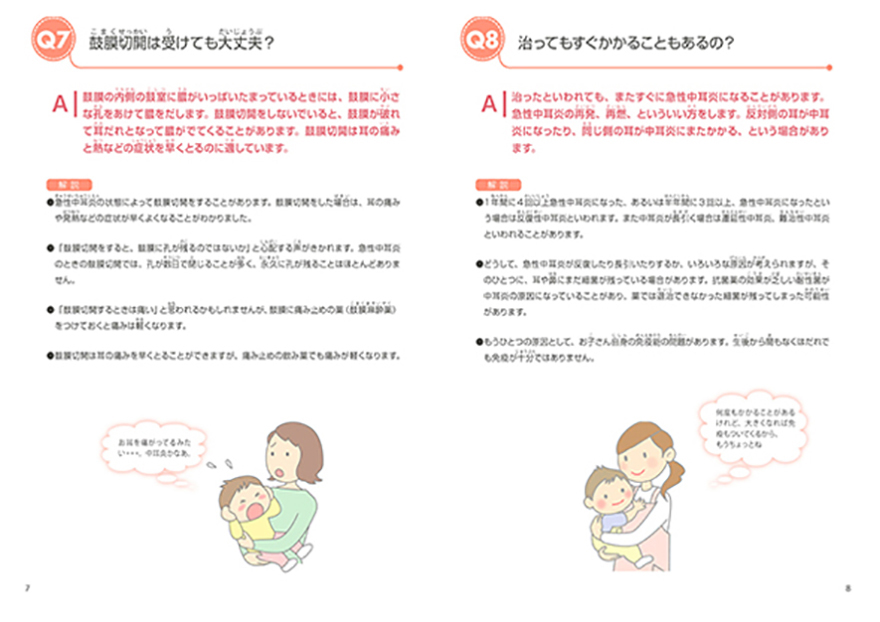 中耳炎にかかった小児の若い母親向けの中耳炎の症状や治療法をイラスト入りで解説。外国人にも分かるようできるだけ平易な言葉で解説しています。
