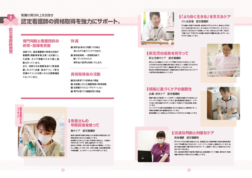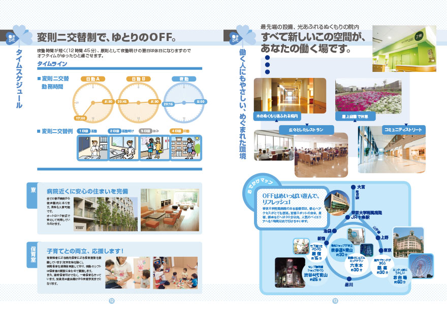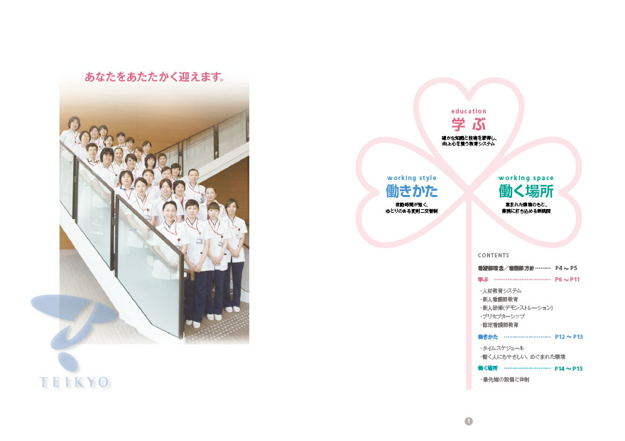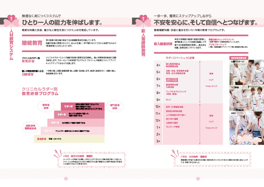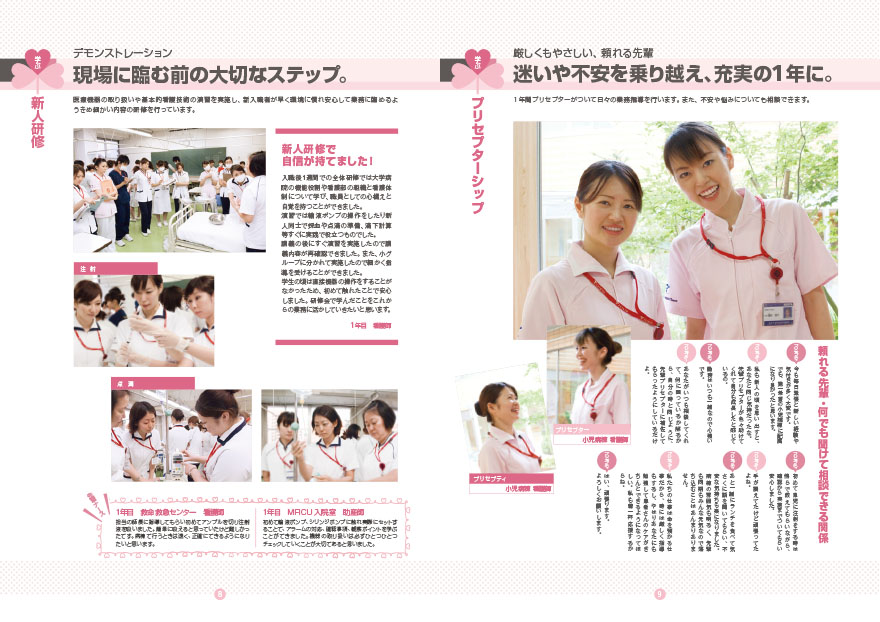就職したい病院って…と若い看護師さんの気持ちになって考えるところから始まり、企画、構成、 デザインと練っていきました。終始若いパワーがあり、楽しい撮影現場でした。