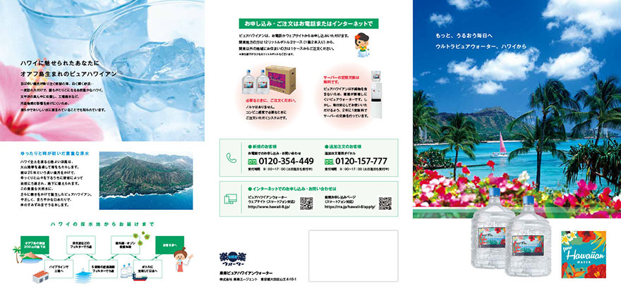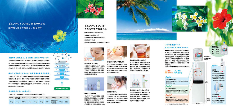 家庭向けとオフィス向けのウォーターサーバーのカタログ。美味しいだけでなく、生活のいろいろな場面で役立つことを多面的に訴求しました。