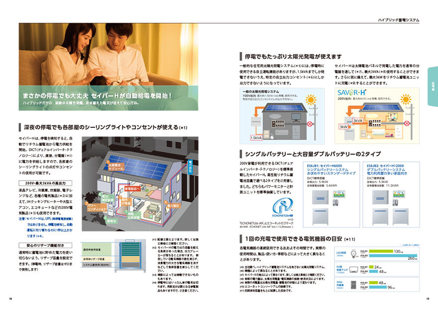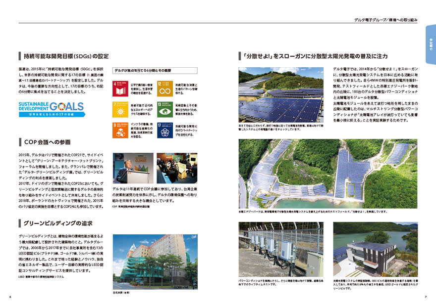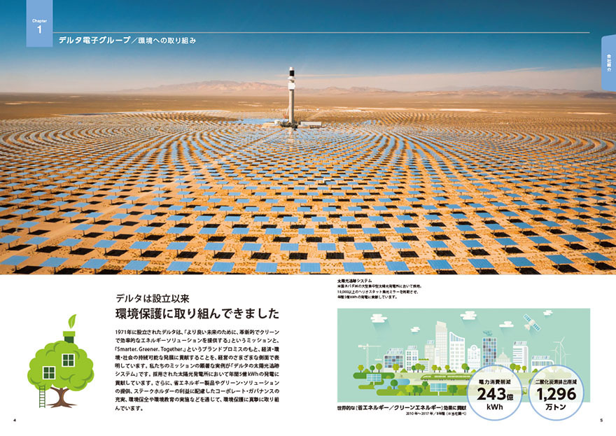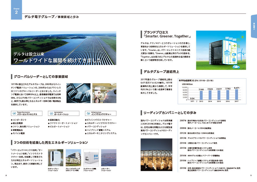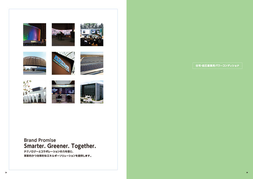 総合カタログという性質上、特定の(代表的な)機種の画像をメインにして美しく配置するよりも、「どんな製品群のカタログなのか」ということに、重きを置いて考えてみました。太陽光によって電気を作ることをピクトグラムで簡素に表現し、地色はコーポレートカラーの青で「デルタ電子のカタログ」ということを強調しています。