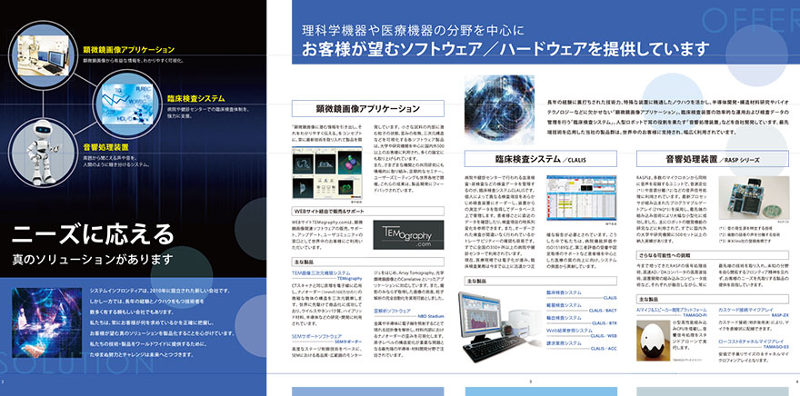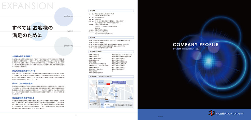 顧客の満足のために道筋を探り、辿って、達成する。この3段階の過程を広がる光の輪で表現してみました。また、黒バックの中心にある光源は冷静に状況を見つめ、分析する瞳のイメージです。シンプルですが静謐で緻密な印象を強調した表紙を開くときに、「会社案内中面 = システムインフロンティア」への期待感や興味を煽るものとなれば良いかと思います。