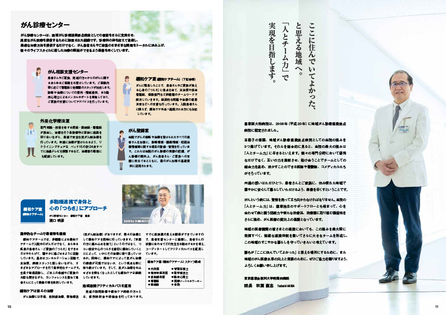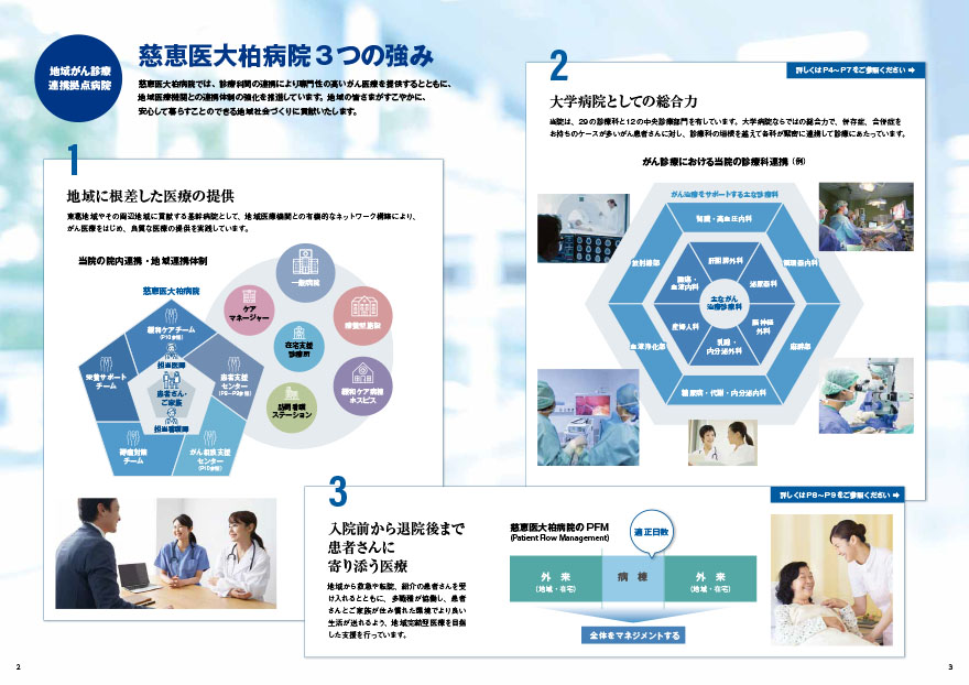 慈恵医大柏病院様は「地域がん診療連携拠点病院」に指定されており、地域に根差した医療体制強化のため、地域医療機関に向けてさらなる連携を呼びかけるパンフレットです。病院の特長を冒頭に提示し、医師の皆様をはじめとするスタッフの取材記事を通してより説得力のある説明につなげています。スタッフ間のチーム力、一人ひとりの想いが視覚的にも伝わるよう、さまざまな表情の写真を多用し、臨場感のあるビジュアルにまとめました。