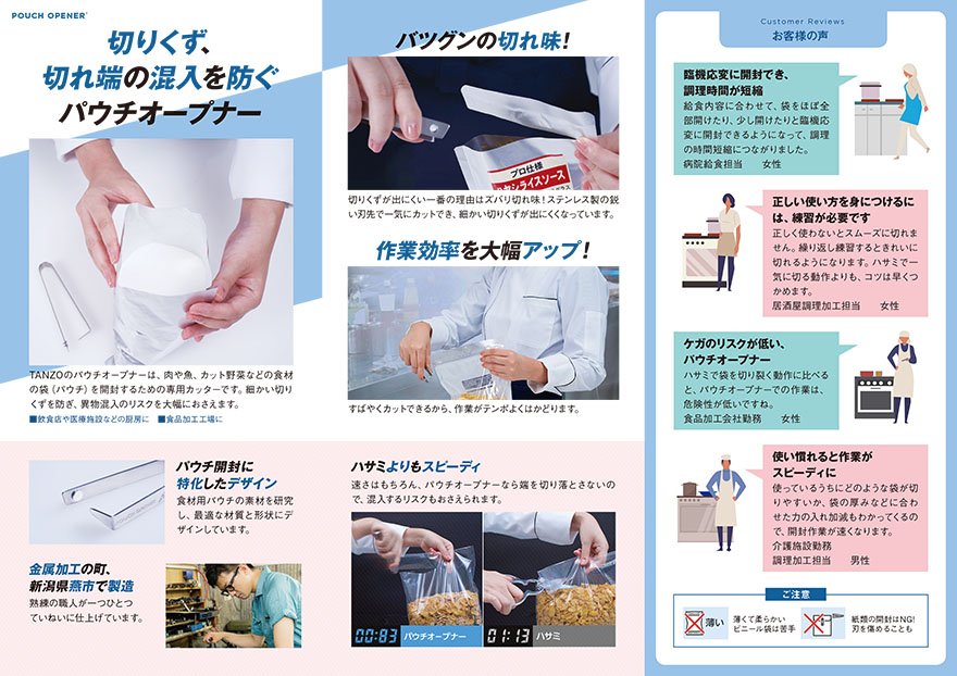 飲食店の厨房や食品加工工場などで大量に使用される食材の袋(パウチ)を開封するための専用カッターのご紹介リーフレットです。先にリニューアル公開されたウェブサイトの画像やモチーフ、コピーなどを用い、イメージを統一。サイトへの誘導を前提とし、情報もコンパクトにまとめています。