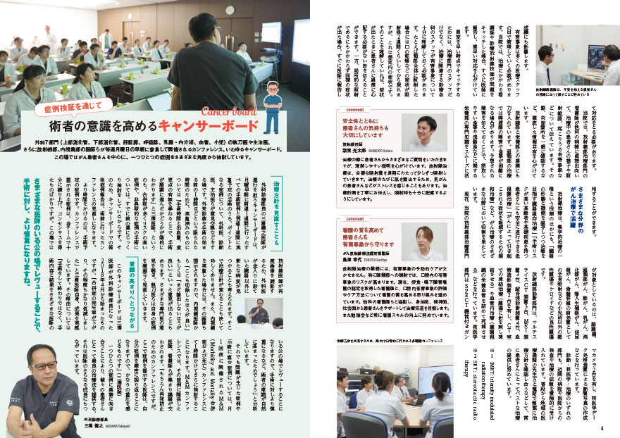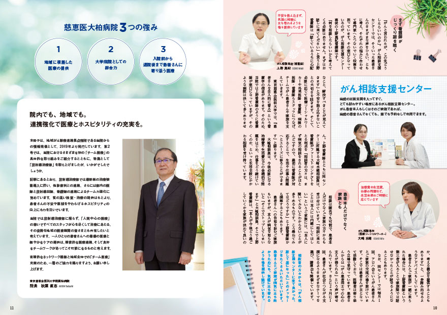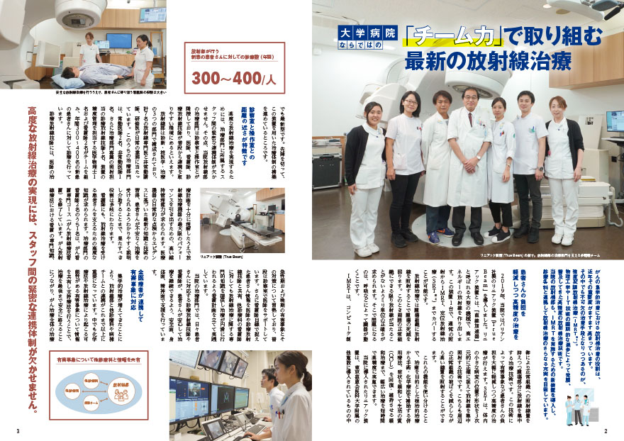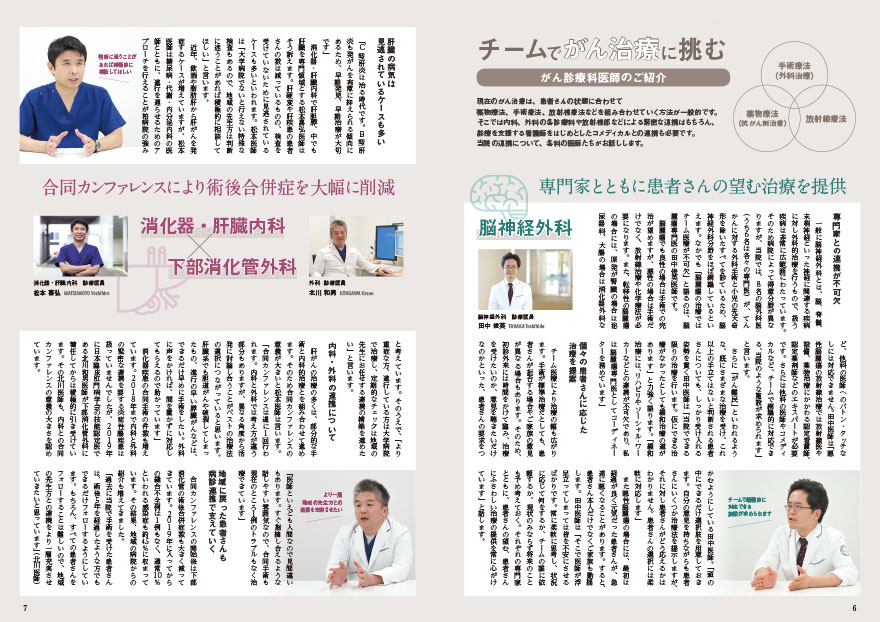 地域がん診療連携拠点病院として地域医療機関に向けてがん診療の連携を呼びかけるパンフレットの第2弾です。今回は放射線科の特集を中心に、キャンサーボードの様子や診療科間での連携をテーマにした取材など、第1弾とは異なるアプローチで真摯に患者さんと向き合うスタッフの強い使命感を伝える内容となっています。また今回は雑誌風のデザインで文章を縦組み右綴じとしました。
