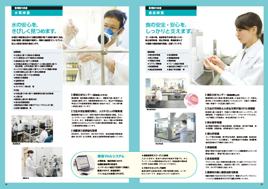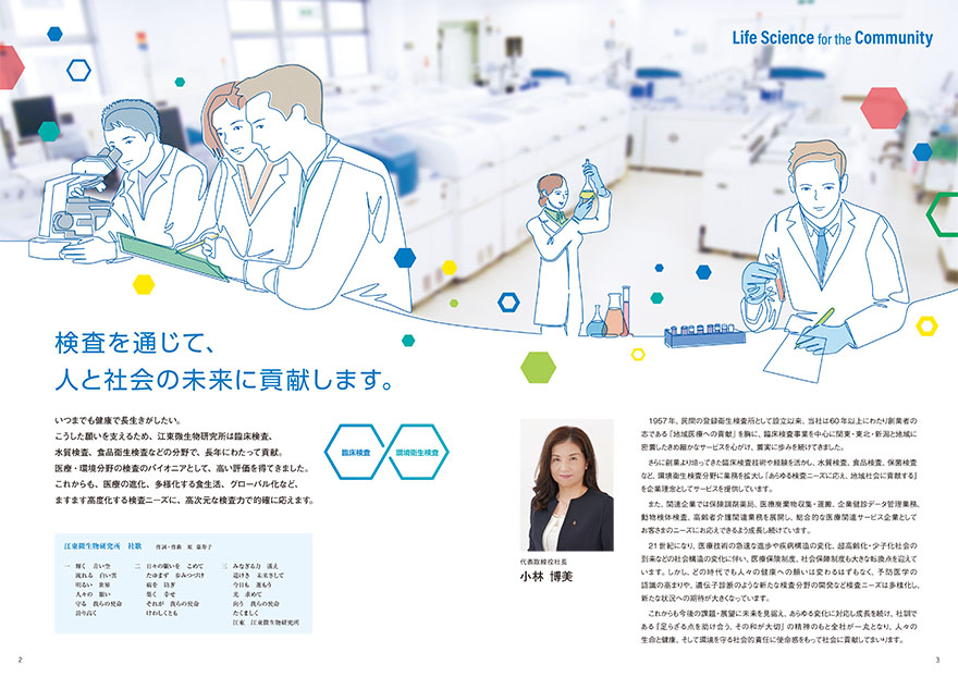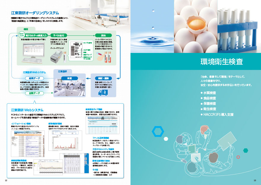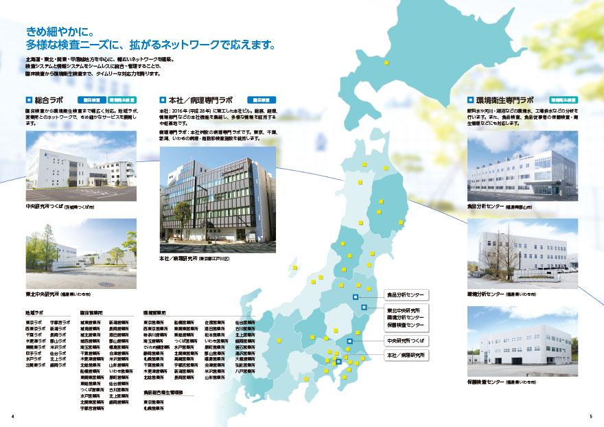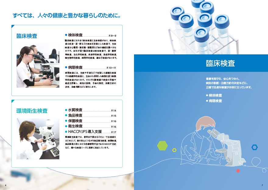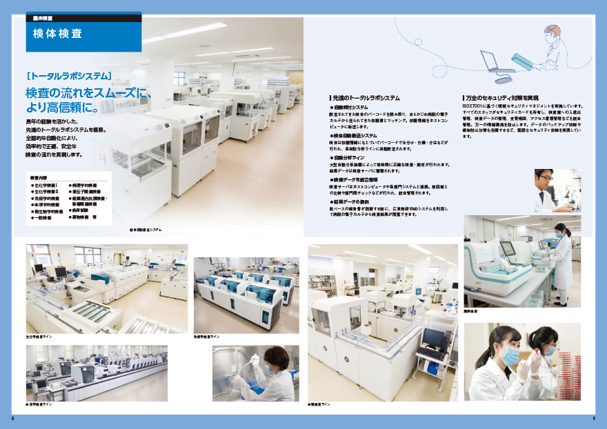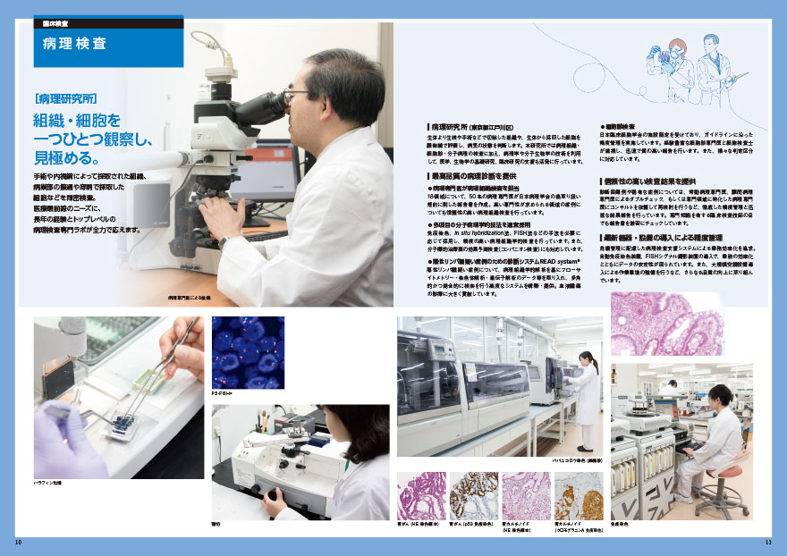 10年ぶりの改定デザインです。様々な臨床検査、病理検査をわかりやすく分類しました。研究所の方にもご協力を仰ぎ、仕事中のシーンを多数撮影させていただきました。イラストと組み合わせて親しみやすいデザインに仕上がりました。