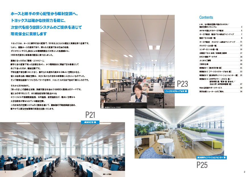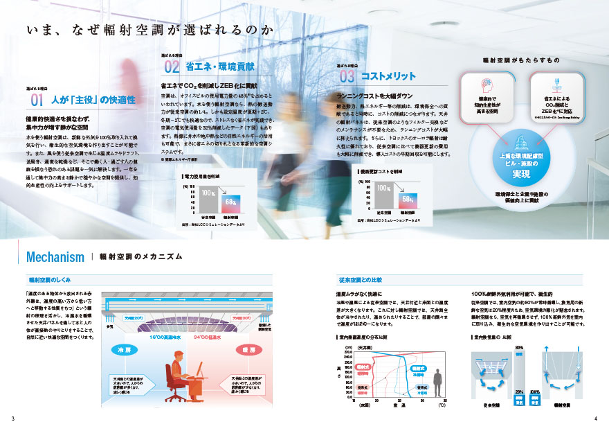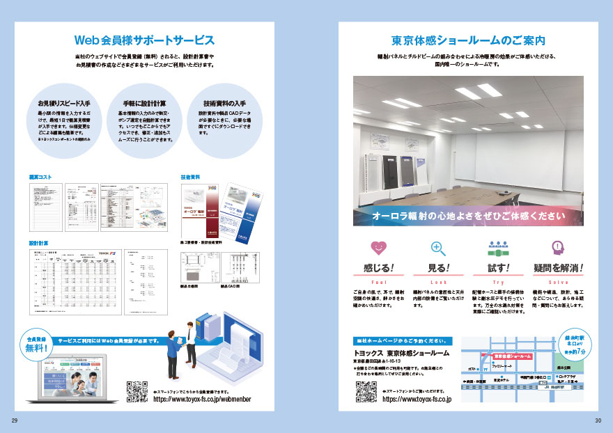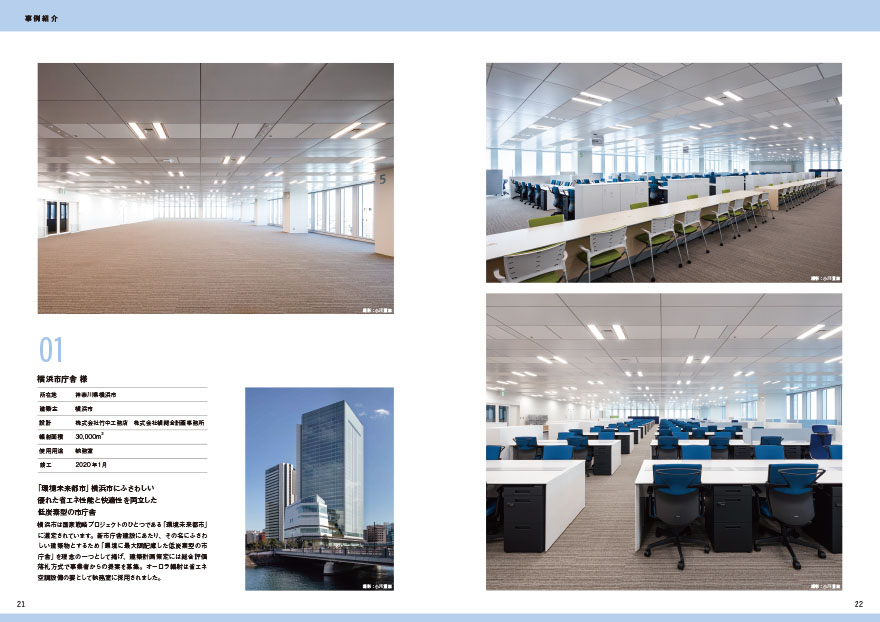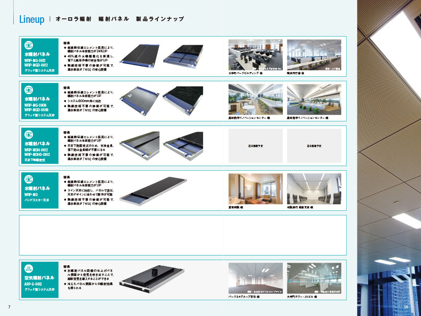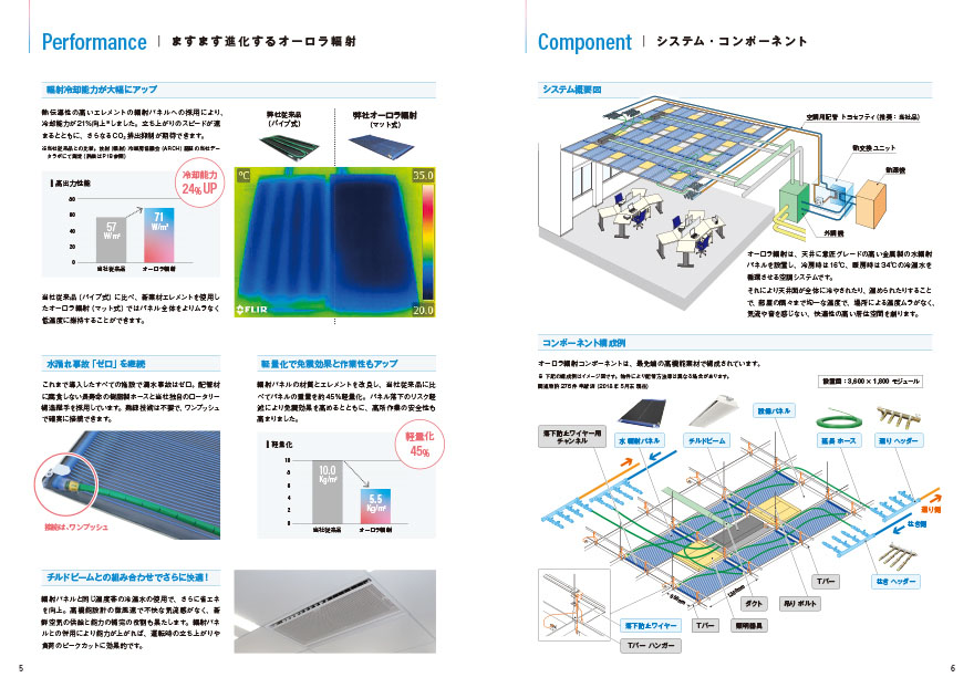 輻射空調「オーロラ輻射」の総合パンフレットです。事例紹介とカタログ機能も備えており、製品一覧を片観音で見やすくするなど、構成からご提案させていただきました。完成までには時間を要しましたが、ほとんどがリモートでのお打ち合わせだったものの、やり取りはとてもスムーズでご納得いただける仕上がりになったのではないかと思います。
