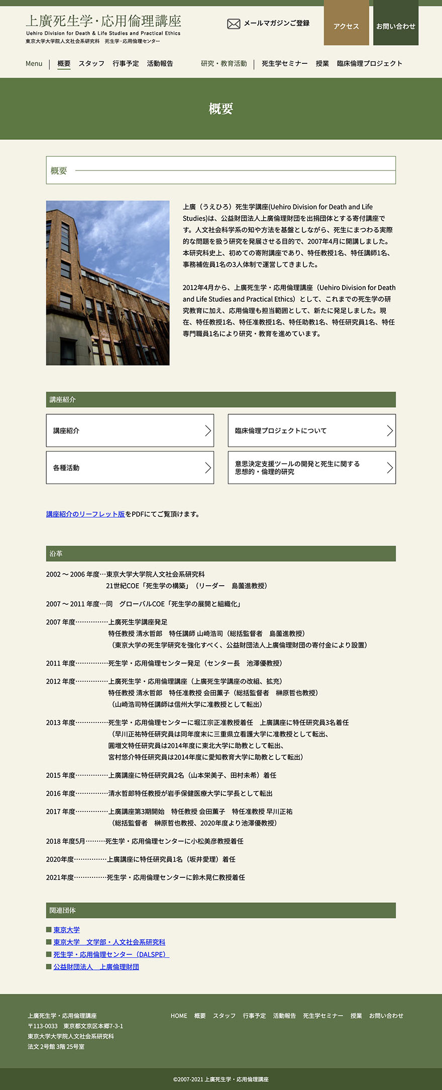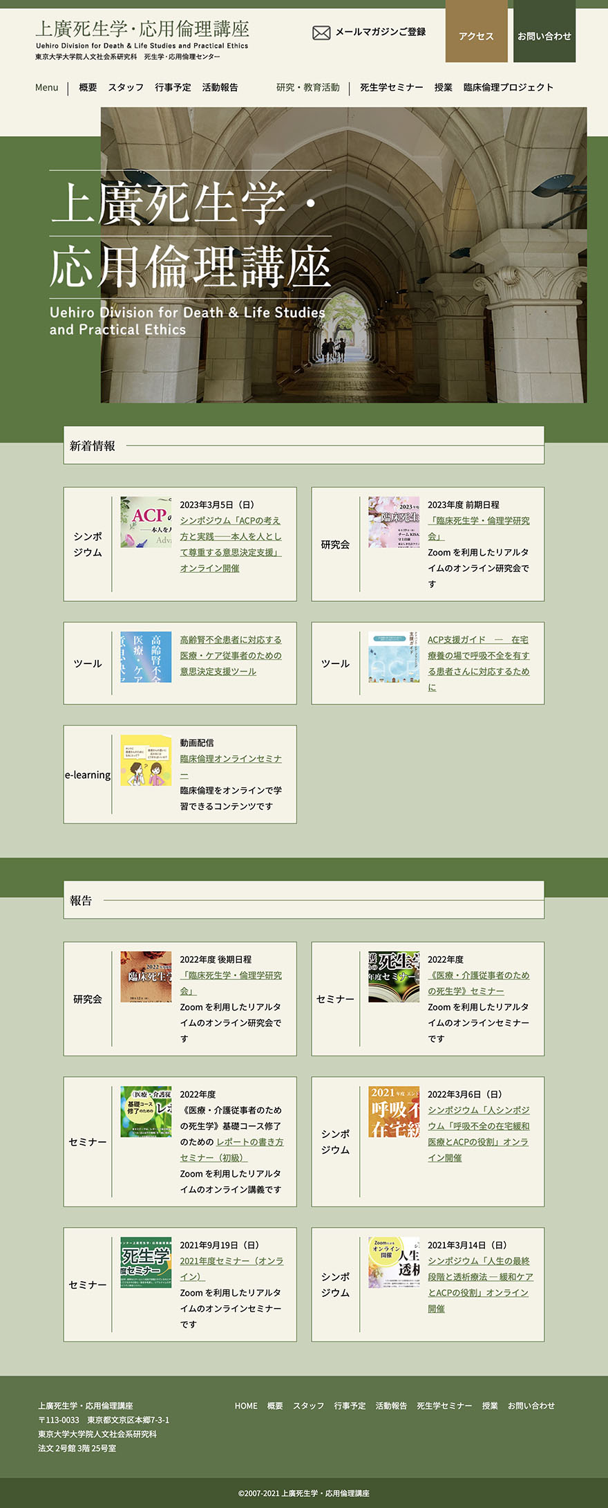 死生学を象徴する大樹の写真をメインに、全体をグリーン系にまとめ落ち着いたイメージに統一しました。