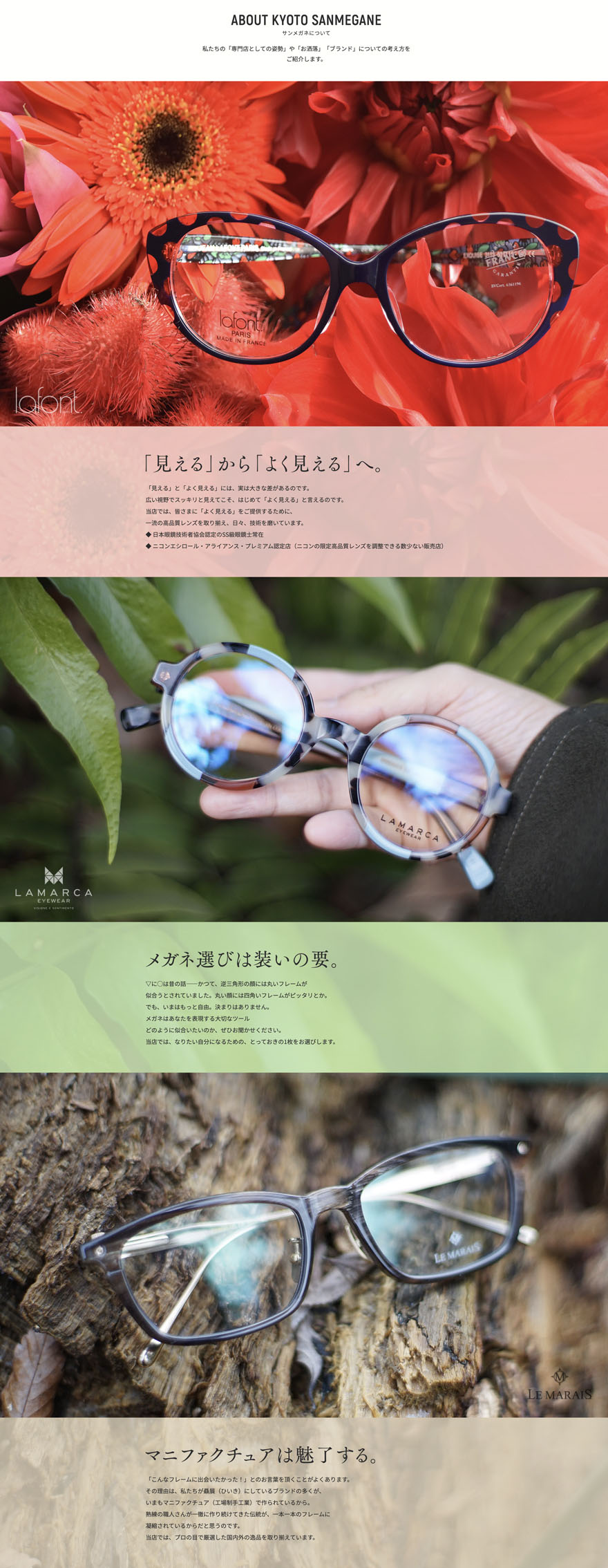 以前のサイトはページの構成が複雑でなかなか目的のページにたどれないので、できるだけシンプルなページ構成と街中のメガネ屋と差別するため、お洒落なメガネフレームと確かな技術でホームページを作りたいとお聞きしました。