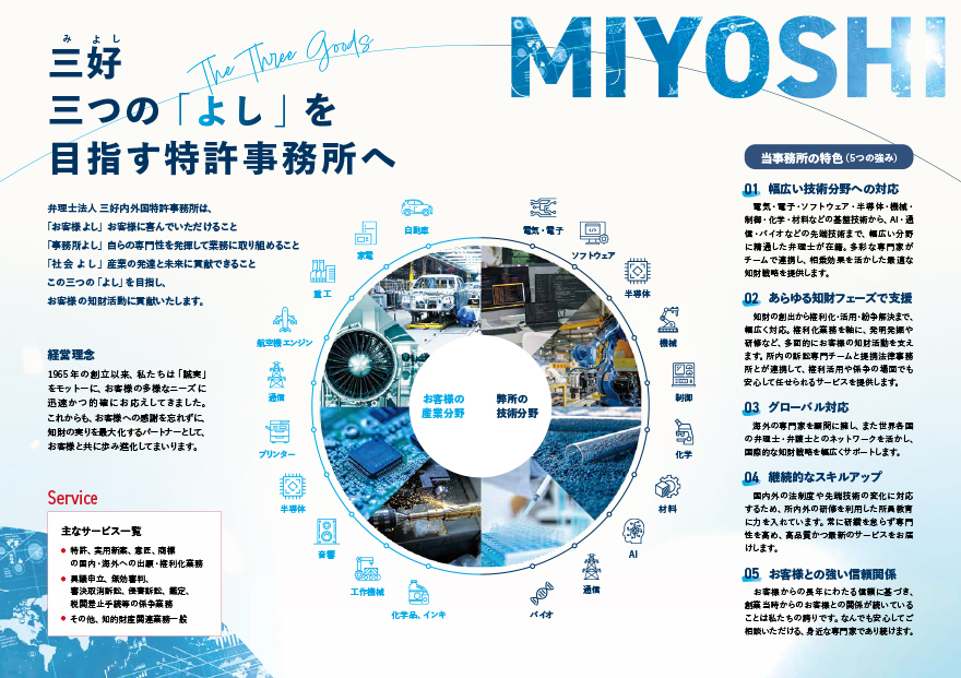 1965年創業の歴史を持つ三好内外国特許事務所様の法人化(2025年11月)に伴い、事務所案内パンフレットのリニューアルを担当いたしました。新体制の門出を象徴するにふさわしい「信頼感」と「革新性」を両立させることが求められました。