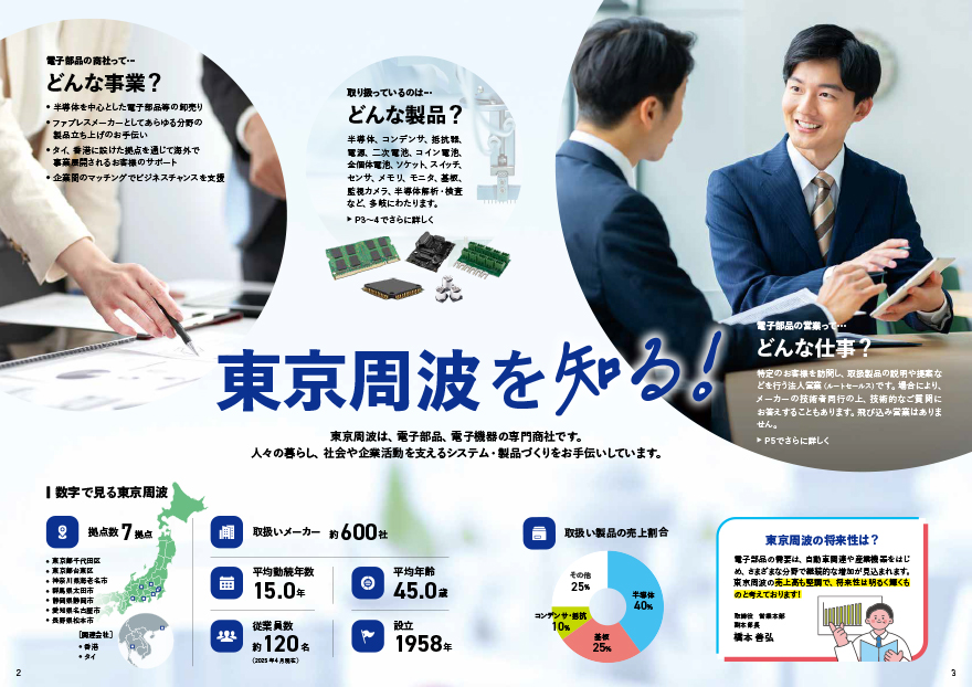 電子部品・機器の専門商社である東京周波株式会社様の、営業職をメインとした新卒採用冊子を制作。BtoB企業ゆえに学生には馴染みが薄いという課題に対し、「働く自分を具体的にイメージできる」よう、ビジュアルを重視した誌面構成をご提案しました。