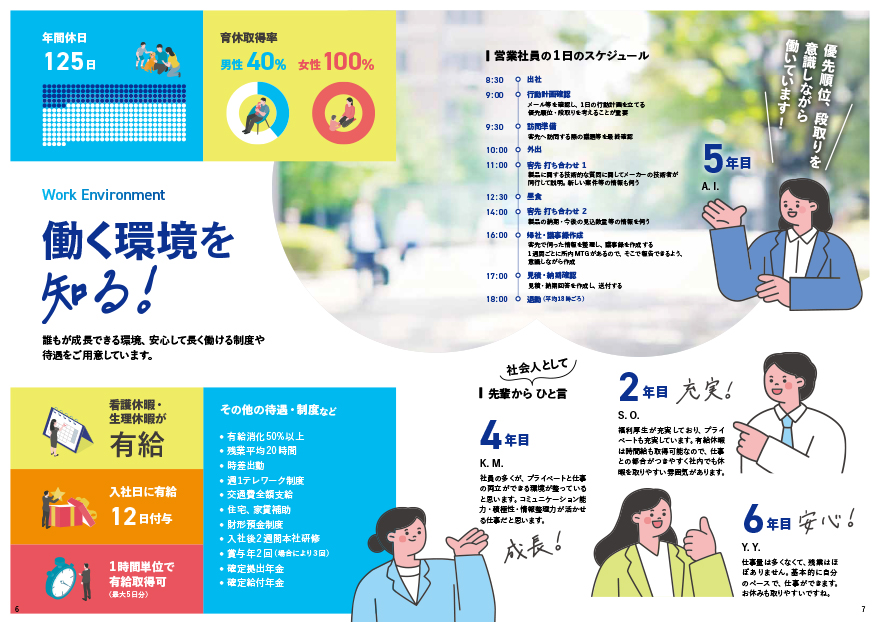 「東京周波を知る!」をコンセプトに展開。明るいカラーリングと豊富な写真で、親しみやすい誌面を追求しました。先輩社員の一日のスケジュールや、勤続年数ごとのリアルなメッセージを見開きで配置し、入社後のイメージを醸成。福利厚生や年間休日、残業時間、育休取得率などをアイコンで整理し、BtoB商社ならではの「長く働ける環境」を視覚的にアピールしました。