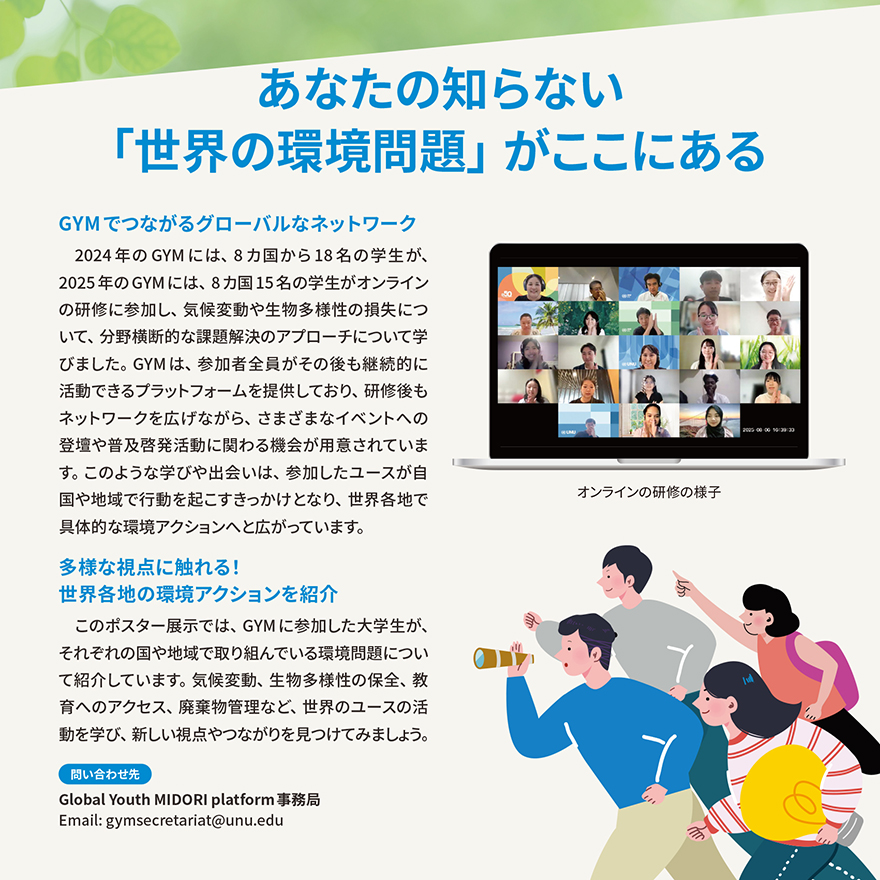 国連大学の主要な研究機関であるUNU-IAS様の拠点(東京本部ロビー)にて、世界各国のユースによる環境アクションを紹介するポスターを制作。国や地域で異なる多様な環境課題を可視化し、来場者が自らのアクションを考えるきっかけとなる「教育的・啓発的な展示空間」の構築が求められました。