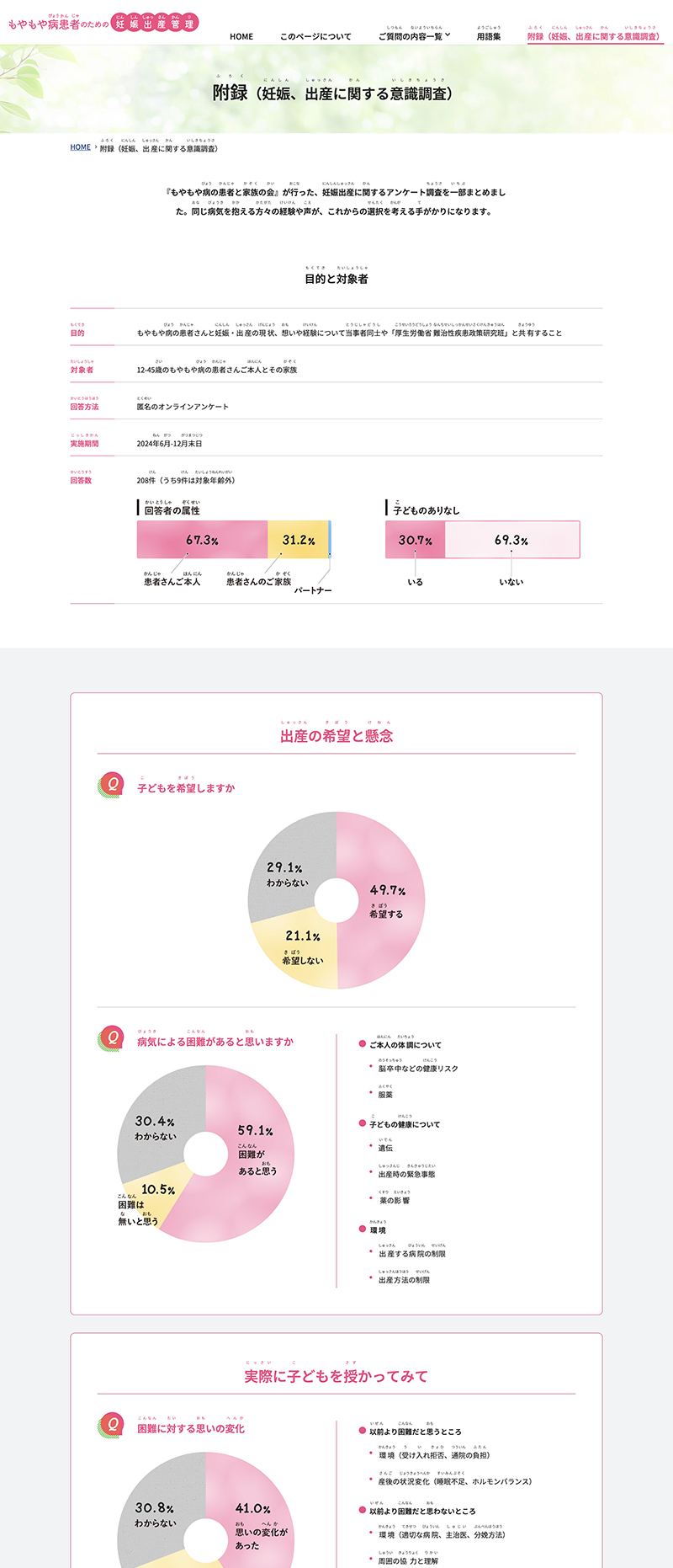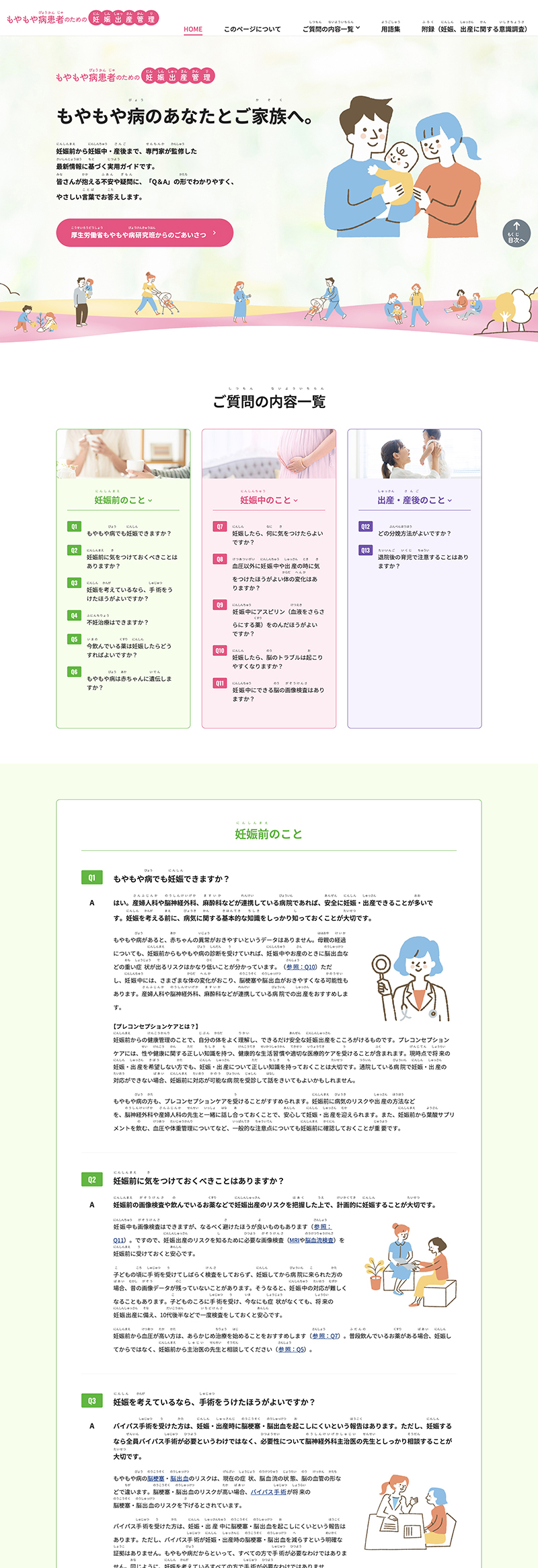 厚生労働省の研究班による「もやもや病妊娠出産パンフレット策定プロジェクト」の一環として、患者様およびご家族向けの特設サイトを制作。もやもや病を抱えながら妊娠・出産を迎える女性が、ライフステージに応じた正しい情報を得られる「信頼できる情報基盤」の構築が求められました。