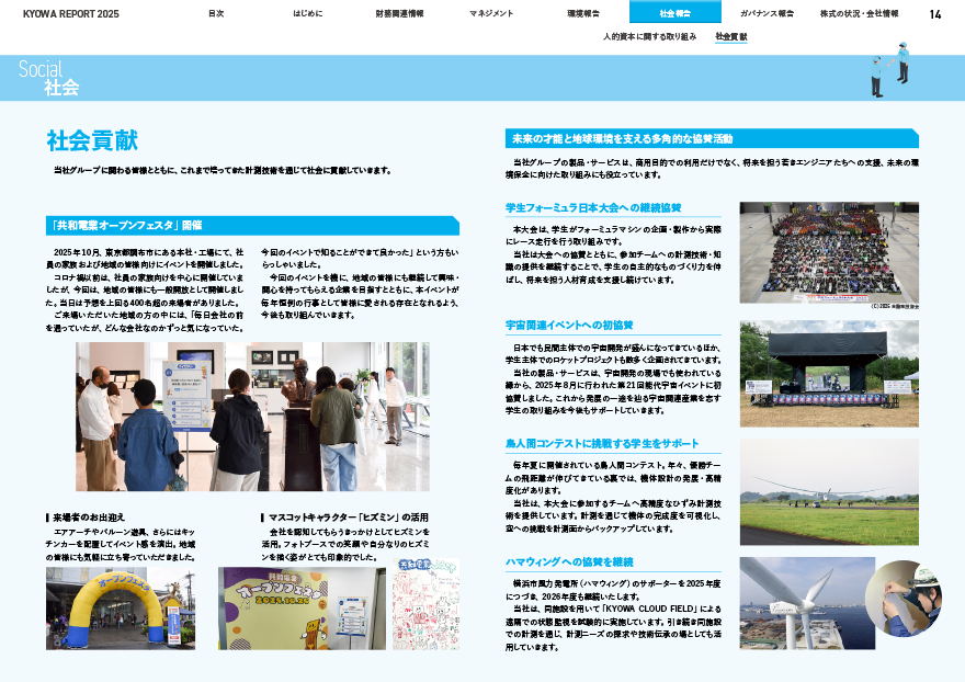 Web上での閲覧を前提としたPDFのため、誌面上部にグローバルナビ機能(インタラクティブ要素)実装しました。どのページからでも目的のセクションへ即座に移動でき、ユーザーの利便性を大幅に向上させています。企業の成長を分かりやすく丁寧に伝え、社会貢献や社内育成も整理されたレイアウトでアピールします。技術者の日常や働く姿をアイソメトリックなイラストで描き、キービジュアルとして展開。専門性の高い計測事業に「親しみやすさ」を加え、ブランド全体の世界観を統一しました