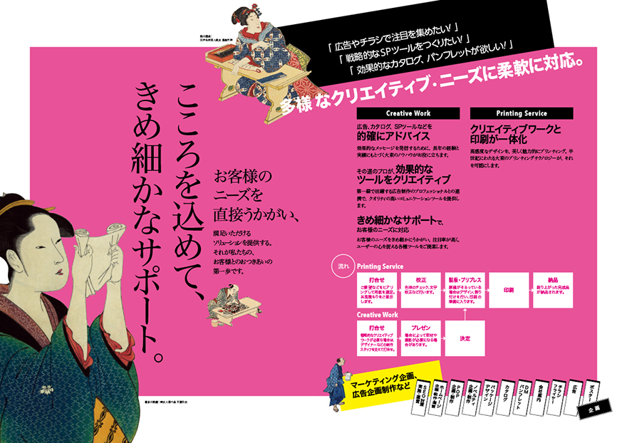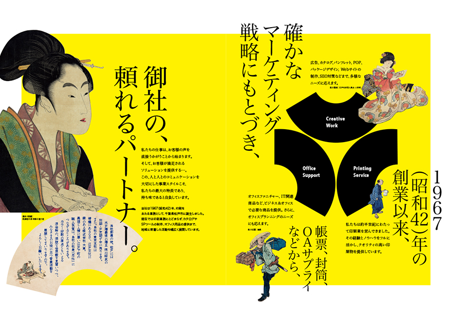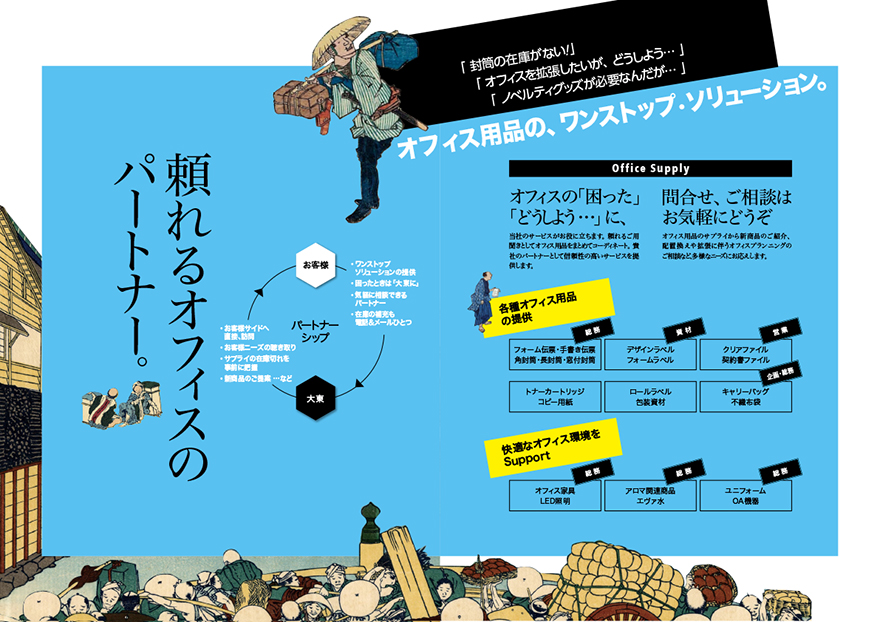 印刷だけでなく、OAサプライなど多岐にわたるサービスを展開している大東様。「とにかく印象に残る事業案内をつくりたい」とのリクエスト受け、印刷のルーツである浮世絵(版画)をモチーフに会社案内を制作しました。パンフレットのイラスト、写真、コピーを使用し、印象に残るコミカルに躍動する動画を制作。1分18秒にコンパクトにまとめました。