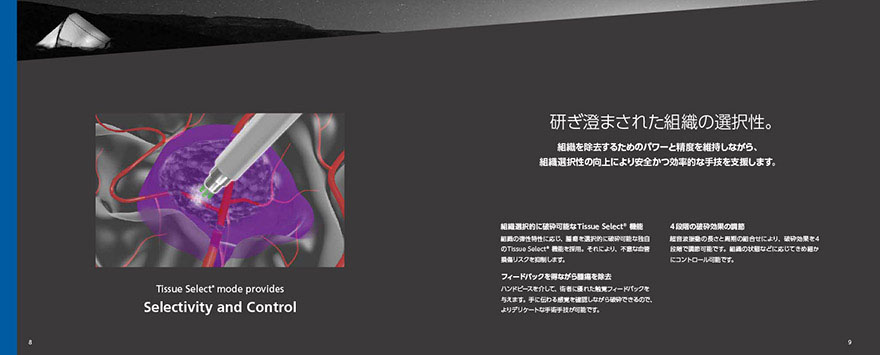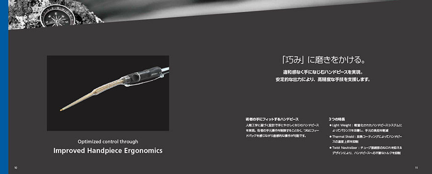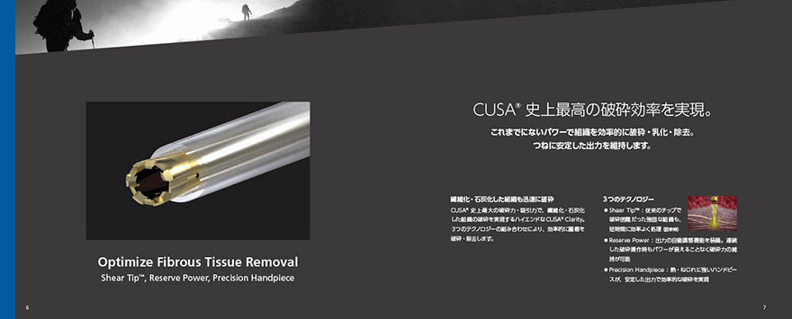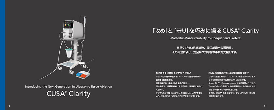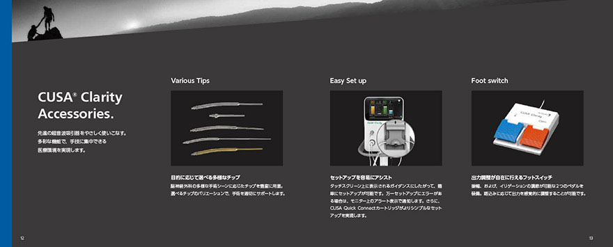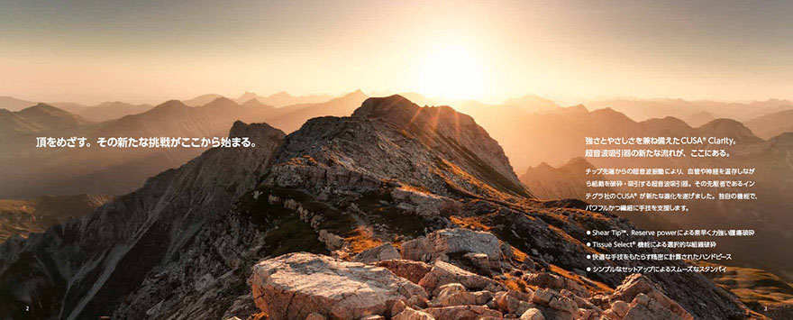 超音波吸引器 「CusaClarity」の製品パンフレットを元にインパクトムービー®を制作いたしました。パンフレットでは病理に立ち向かう医師を登山家のイメージで表現し、各ページに登山のモチーフを使用。動画ではその写真をダイナミックに動かしインパクトを出しました。途中で出てくる手術動画はクライアント支給です。1分18秒にコンパクトにまとめました。
