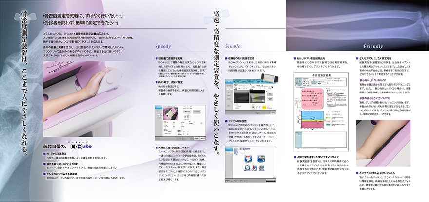 わずか約15秒で測定できるコンパクトな骨密度測定装置「B-Cube」のインパクトムービー®です。製品のやさしい色づかいと曲線のフォルムをパンフレットのデザインに活かし、動画も同様のイメージを展開。「Speedy」「Simple」「Friendly」の3つのキーワードに沿って特長をテンポ良く、わかりやすく訴求しています。