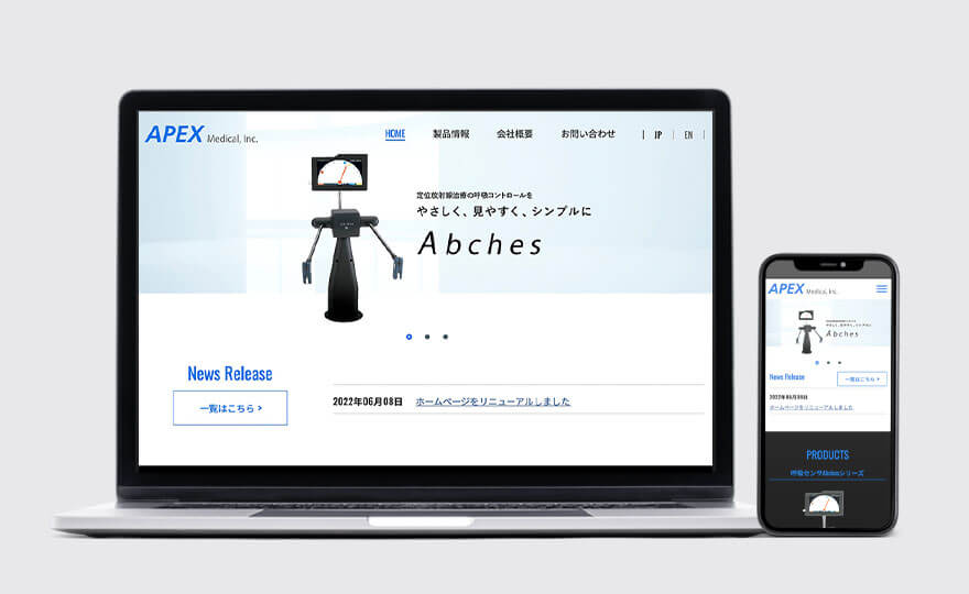 放射線治療時の正確な照射コントロールをサポートするために開発された「Abches」を主に紹介しています。製品の詳細ページと情報ページの背景色を水色と黒に分けるなど、シンプルにわかりやすくデザイン。リニューアル後は検索でも容易にヒットするようになり、お客様には「大変すばらしい出来栄え」とのお言葉をいただきました。